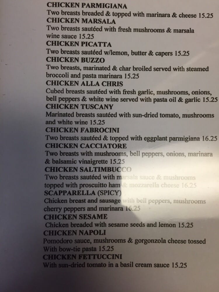 Two chicken breasts sauteed with fresh mushrooms in a marsala wine sauce.